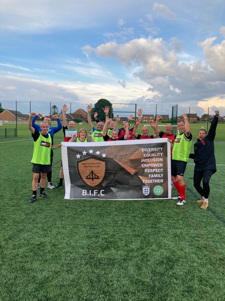 Barton Inclusive FC started after I moved permanently to the area in October 2018; I was keen to volunteer within the Ability Counts game, however at the time, there wasn’t any provision within the town. So, this led me to create BIFC. I actually just remember saying one day as I was sat at home ‘I’m going to create a club!’; this was in January 2019. I hosted a fundraiser in July 2019 and from September 2019, we started our sessions. We began with a session for inclusive football and one walking football session. We welcomed new players, volunteers and began to plan for our future, when the COVID lockdown was announced in March 2020. We stayed connected with our players via Zoom, and within the next 12-16 months, we started training at a new facility, introduced Wildcats to our club and continued to welcome new players for both our inclusive and walking sessions. Amongst all this, we delivered a range of initiatives as a club such as our ‘Liam Jinks Cup’, which will be hosted annually. The hard work that has gone into our club from everyone involved led to us being awarded the Lincolnshire FA ‘Club of the Year’ for the 2020/21 season; of which we are immensely proud. We now have over 70 players within our club, which continues to grow with two competitive Ability Counts teams.