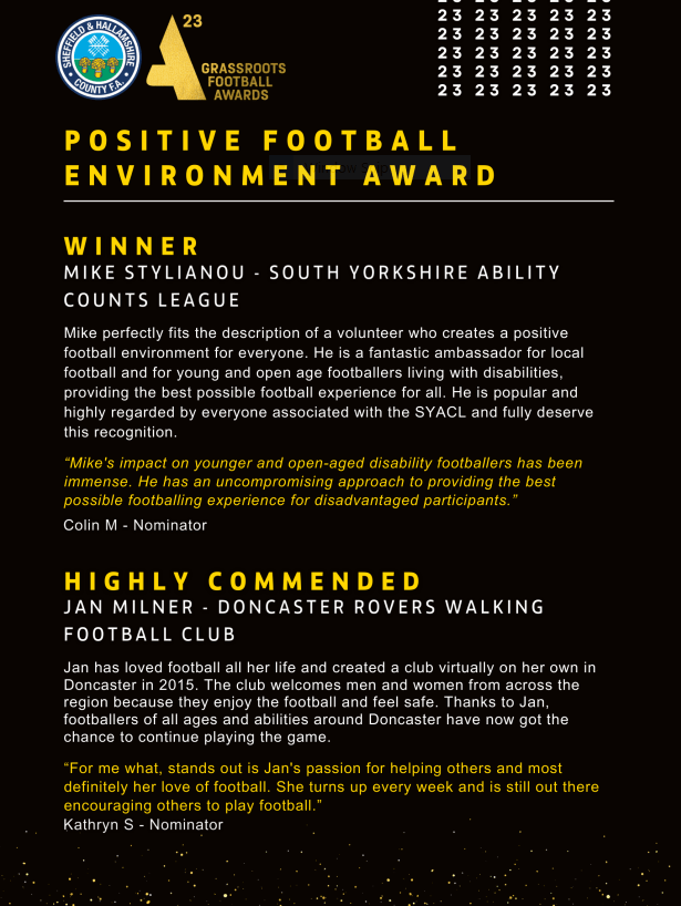 A certificate and award were presented to each winner and highly commended recipient by Sheffield & Hallamshire County FA Intern Chair Brian Coddington.