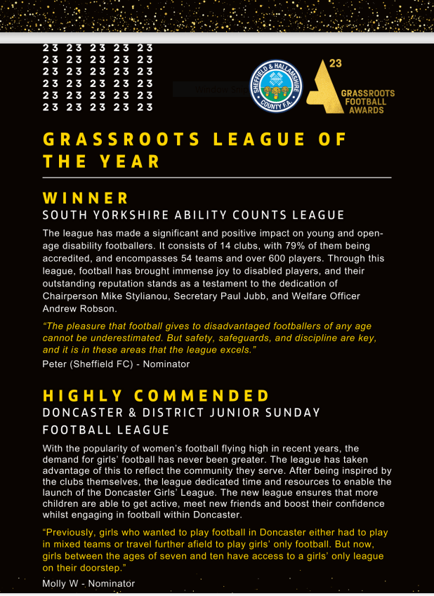 The awards, which recognise local winners and highly commended recipients of the England Football Grassroots Football Awards 2023, were presented by BBC Radio Sheffield Sports Editor Andy Giddings.