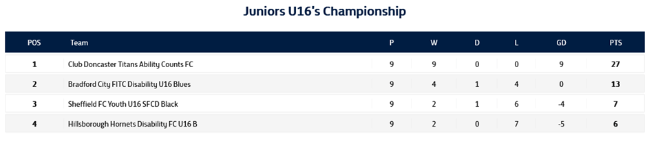 After nine games apiece in the Championship, Titans have a 14-point advantage after nine straight wins. Bradford Blues are second, ahead of Sheffield FC Black, with Hornets Black just one point further back.