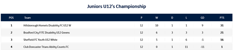 Club Doncaster Titans got the action under way with a win over Sheffield FC Black. After Hornets Black had edged their game with Sheffield Black, they were back on the pitch, this time losing narrowly to Club Doncaster Titans. Bradford Blues beat Sheffield Black then lost to Titans before Hornets rounded off the afternoon with three points from a win over Bradford Blues.