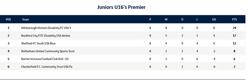 “Fair play to Rotherham who stuck to the job and especially the goalkeeper who made save upon save – and their players were lethal with their finishing!” With each club having played eight games, Hornets Yellow continued with their one hundred per cent record to establish a 7-point lead over Bradford City Amber and Sheffield FC Blue. Rotherham continue to make progress with 8 points, Barton has 6 points and Chesterfield have two with two draws.”