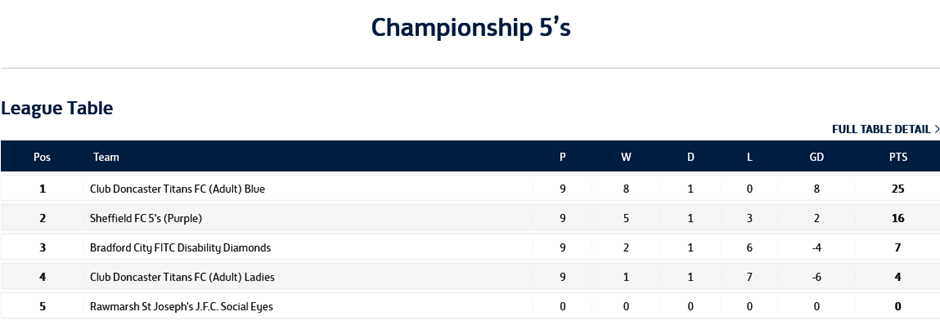 Titans Blue take the trophy with a nine point advantage over Sheffield FC Purple. Bradford City Diamonds were third and Titans Ladies fourth.