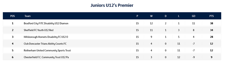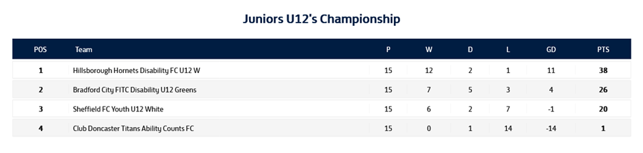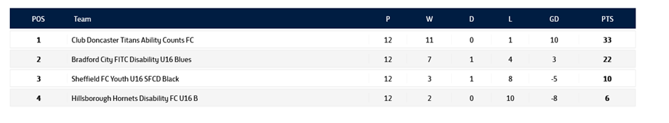 After the dust settled and the medals were on their way home, the final table sees Titans as Champions by eleven points from Bradford City Blues, with Sheffield FC Black third and Hornets fourth.